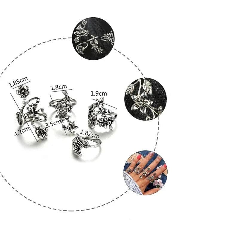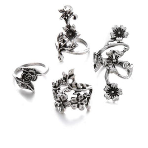 Bagues Femme Style Vigne et Fleurs, Argent Ancien, Set de 4
