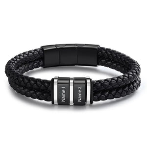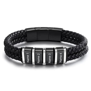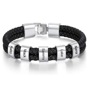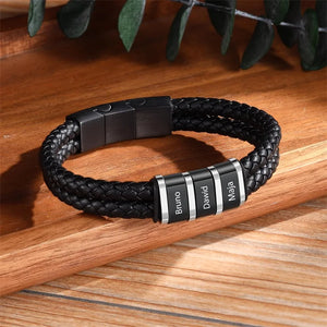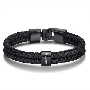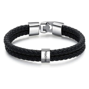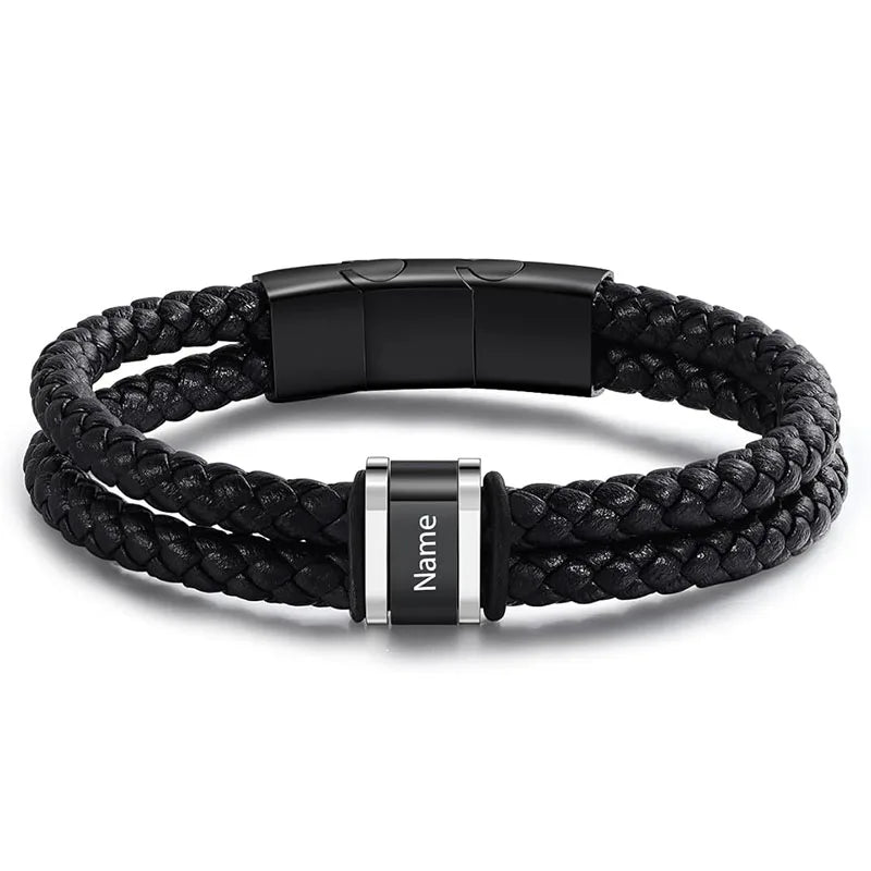 Le cuir tressé apporte une allure masculine sobre et moderne, tandis que les perles en acier inoxydable gravées ajoutent une touche personnelle unique. Ce n'est pas un bijou ostentatoire : c'est un accessoire discret qui prend tout son sens quand on regarde de près.