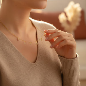 La longueur ajustable 40-48cm s'adapte à toutes les morphologies et tous les styles de décolletés. Le fermoir à mousqueton avec chaînette d'extension permet un réglage précis pour que les lettres tombent exactement où vous le souhaitez.