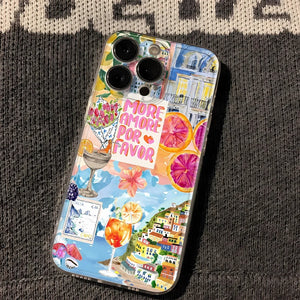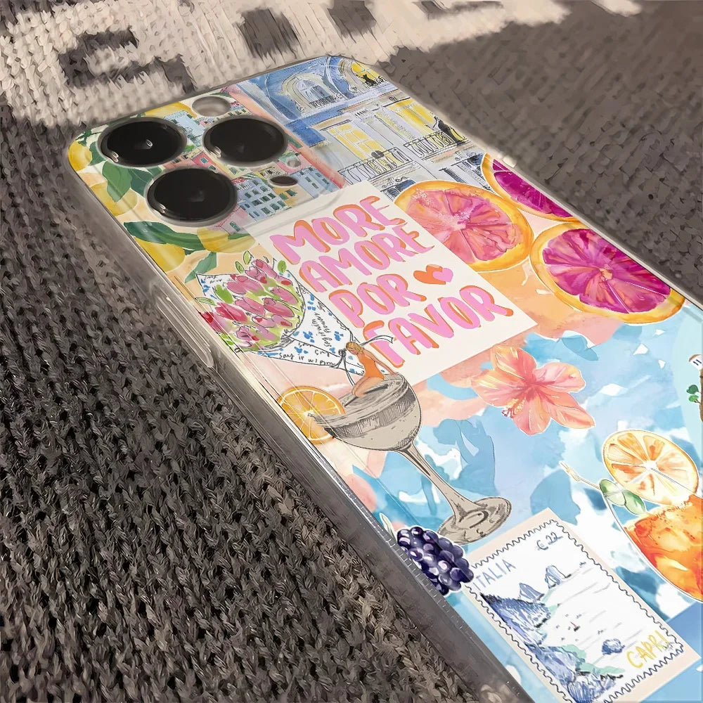 Cette coque iPhone Girly Amore vibes capture l’esprit estival et romantique avec ses couleurs pastel, ses détails inspirés de l’Italie, et son message More Amore por Favor qui invite à voir la vie en rose. Chaque motif raconte une histoire : coucher de soleil sur la côte, cocktails fruités, fleurs éclatantes… un véritable moodboard de vacances.