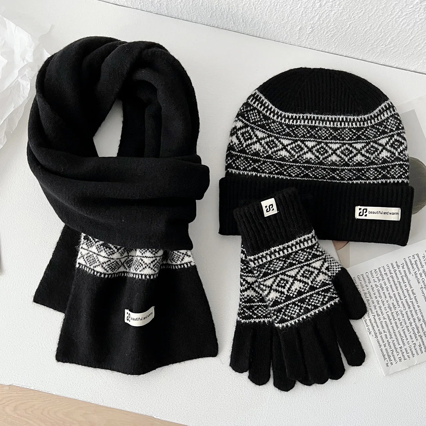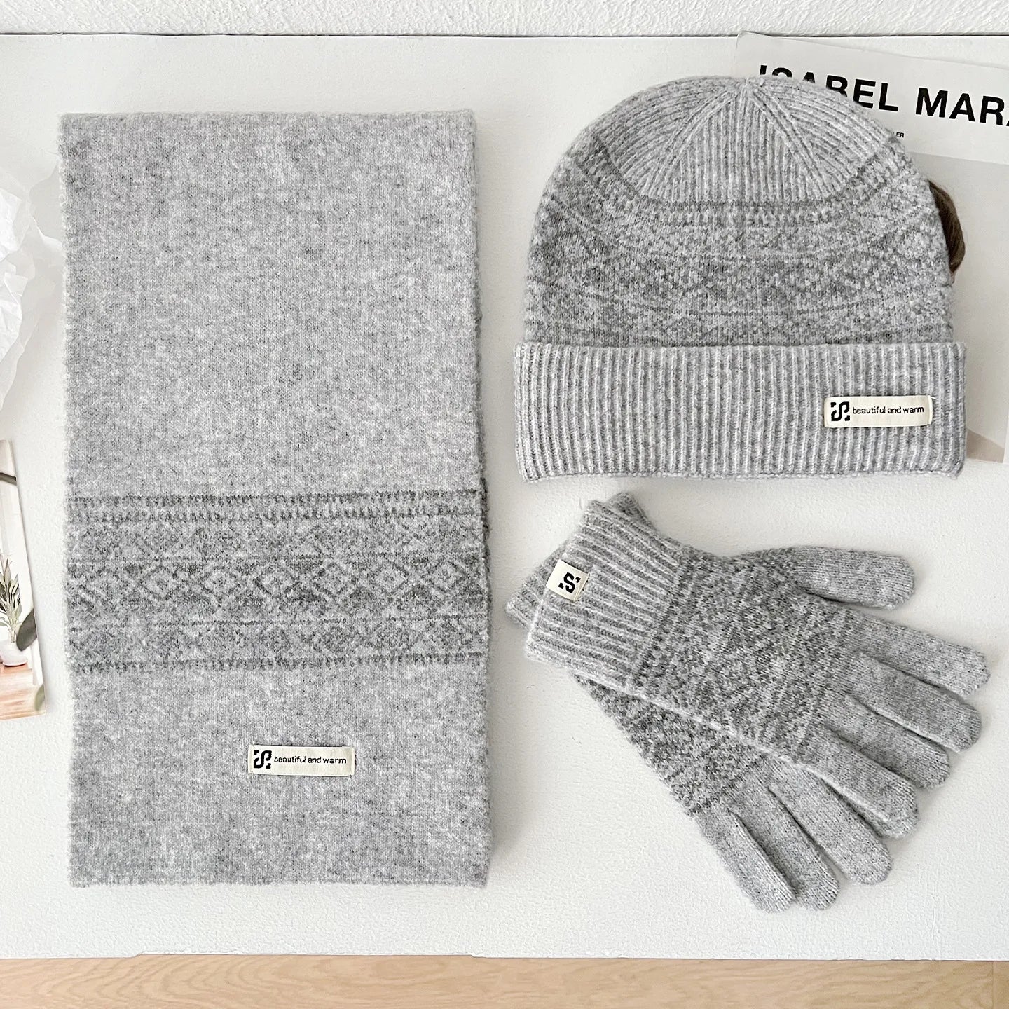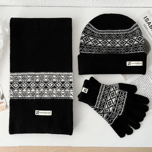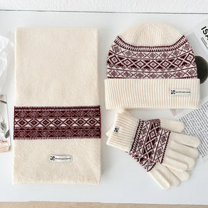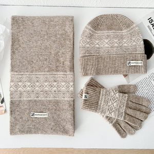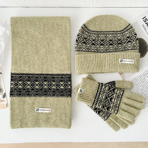 Les gants assortis complètent l'ensemble avec la même qualité de tricot et les mêmes motifs. Ils gardent vos mains au chaud sans être trop épais ni gênants. Cette coordination parfaite des trois pièces crée instantanément ce look soigné et harmonieux.