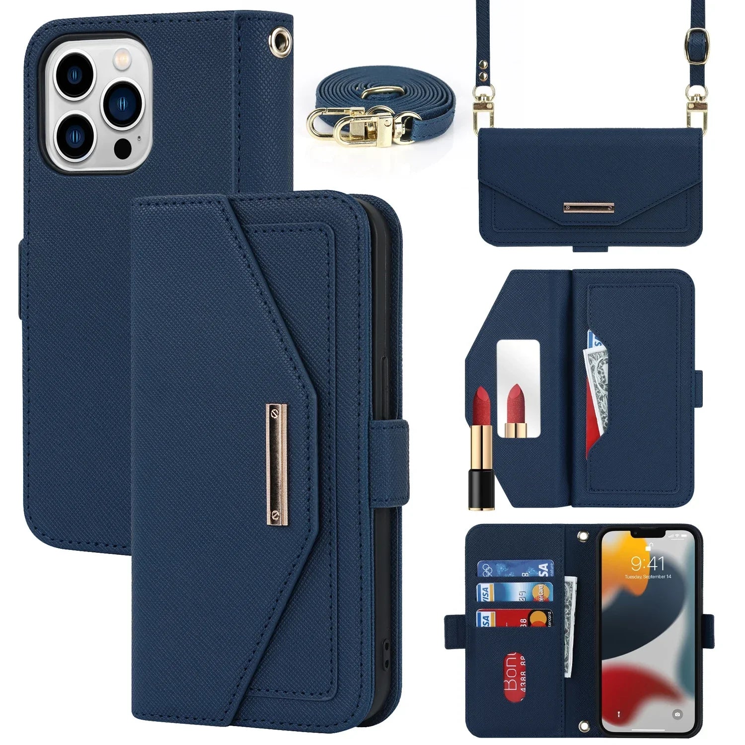 Un étui portefeuille intelligent avec bandoulière réglable, rangement intégré et miroir discret. Sécurité, style et organisation réunis en une seule pièce.