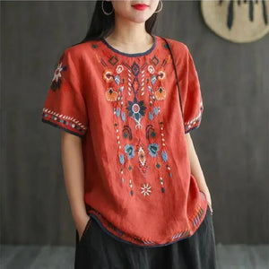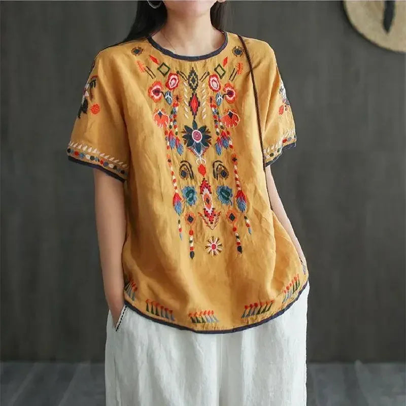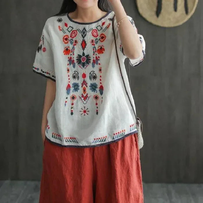 Haut bohème ethnique brodé en coton lin – esprit vintage, coupe ample