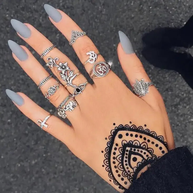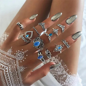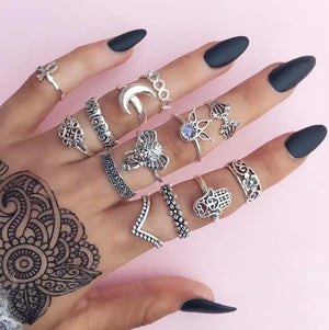 Avec ce lot de bagues argentées rétro, plonge dans un univers inspiré par la nature et la spiritualité. Les détails floraux, les feuilles ajourées et les cristaux scintillants en font des bijoux uniques, parfaits pour une touche de mystère et de féminité.